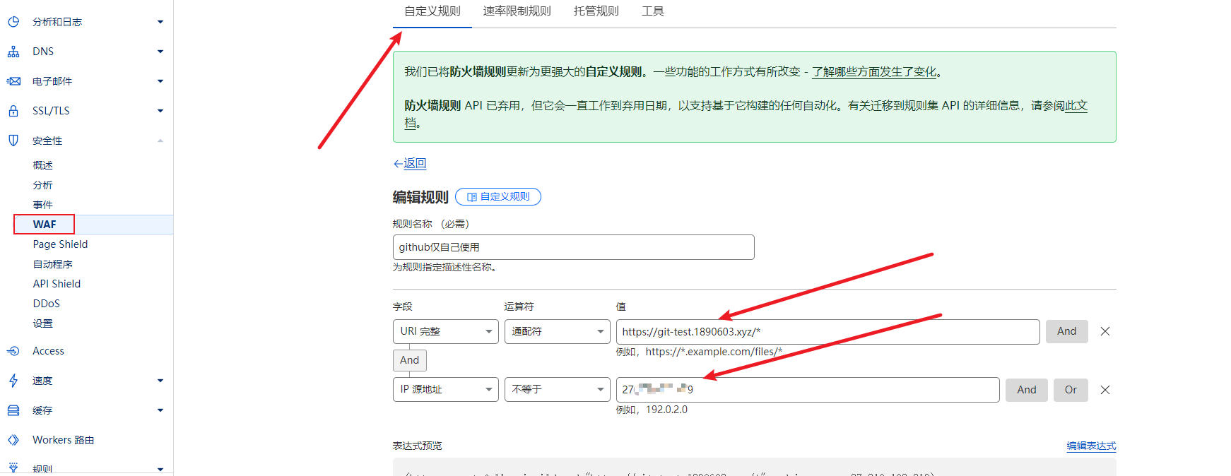 "expression": f'(http.request.full_uri wildcard "https://git-test.1890603.xyz/*" and ip.src ne {ip_address})',