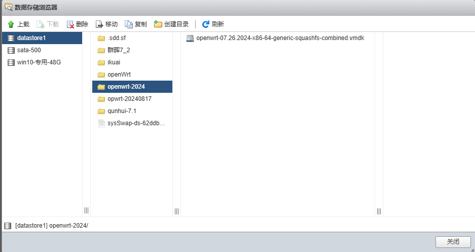 进入esxi控制台,在存储->数据存储浏览器中找个地方上传下载好的vmdk虚拟磁盘文件,这个文件可以理解为就是虚拟机的一个硬盘。