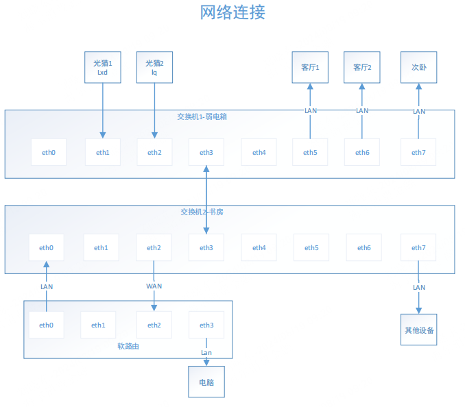 于是希望软路由主机能放在书房拨号,然后通过弱电箱通往各个房间,书房与弱电箱只有一条网线,解决办法是通过网管交换机。