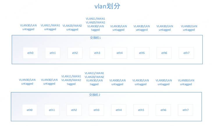 两条宽带光猫的wan口连接到弱电箱的交换机,交换机的这两个口分别是单独的网络分组vlan,一个vlan11,一个vlan20,标签是untagged