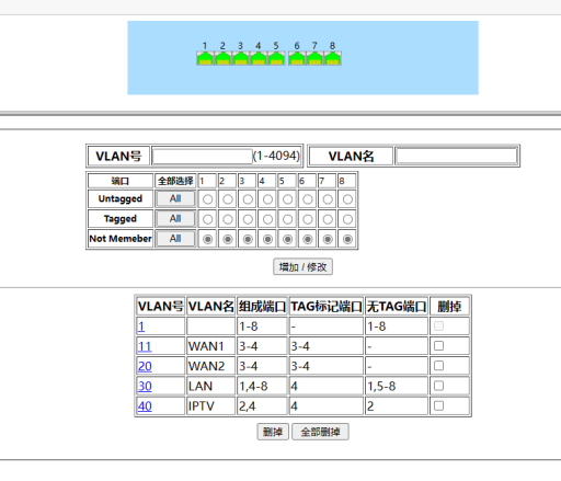 同样的思路,使用这种方式,iptv也可以一块接入,给它分配一个vlan40,弱电箱的交换机这个vlan的口接光猫上iptv的口,其他房间的哪个网线需要连接iptv盒子,就把对应网线连接的交换机口的vlan改成vlan40就可以了。