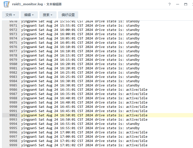 echo "yingpan5" `date` hdparm -C /dev/sde | grep state >> /volume2/aliyun/raid1_monitor.log 2>&1