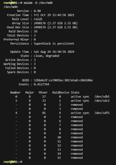 上面显示的是都是1,其中sdd和sde都已经移除。