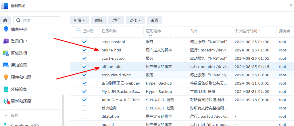 一开始尝试网上的方法,使用群晖自己控制面板的设置,发现硬盘还是不休眠,只有usb的硬盘生效了。