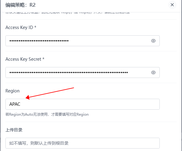 重点是下面图片的地方,区域是你新建存储时选的区域,我一开始没填怎么也不成功。